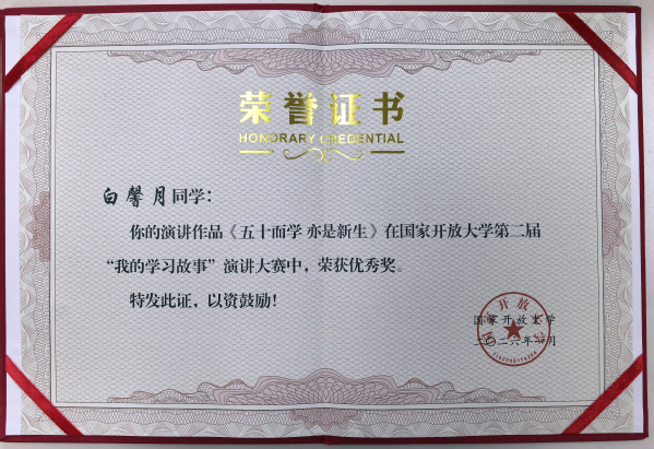 近日,国家开放大学第二届“我的学习故事”演讲大赛评选结果正式揭晓,我校浦口开放大学学子白馨月凭借作品《五十而学,亦是新生》喜获大赛优秀奖。浦口学习中心李岗、蒋智辉、陈颖、谢思思、王慧娟五位老师获评“优秀指导教师奖”。
