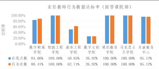 从课程所属院部来看,智能工程学院、通识教育学院、马克思主义学院“在线天数”及“在线行为次数”达标率均为100%。